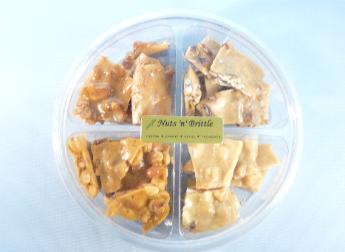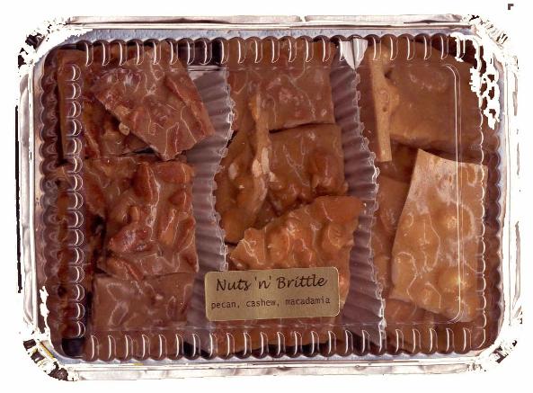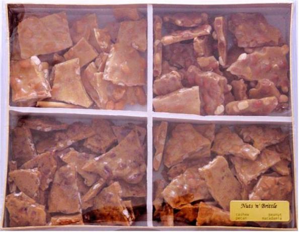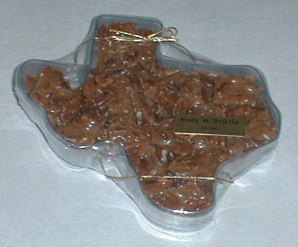 Nuts'n'Brittle 2001, Nuts'n'Brittle came into being. Homemade brittle is available in cashew, macadamia, peanut and pecan varieties. Packaged in 1/2 and 1 pound containers, you may choose a Deluxe assortment of 2 or 3 varieties or a Premium assortment of 1/2 pound of each of the four brittles. Brittle may also be packaged in a Texas shaped container which holds 1 pound. Premium Assortment, 2 lb box Large Assortment Deluxe Assortment, 1 lb box Deluxe Assortment Specialty Box, 1 lb Texas - one pound Sampler Click here for Nuts'n'Brittle Descriptions & Price List |